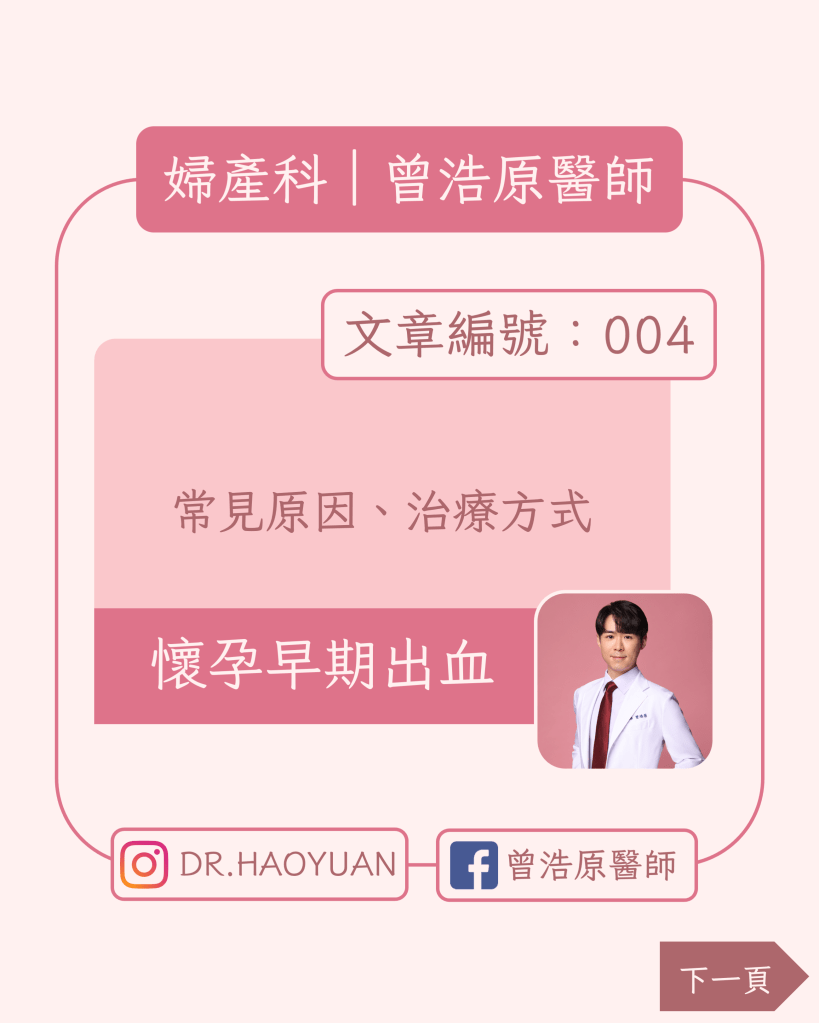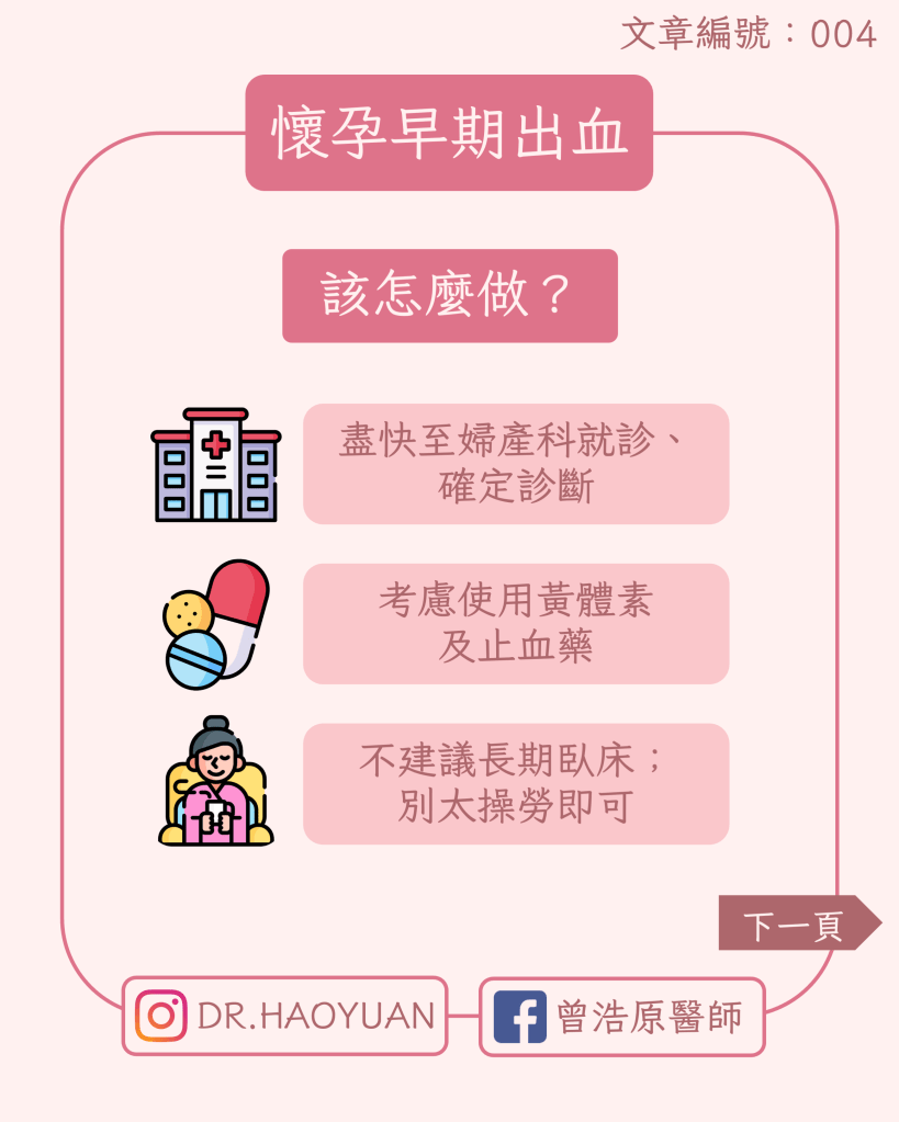 - 懷孕早期出血應盡快就診,以排除子宮外孕及流產等較嚴重的狀況。