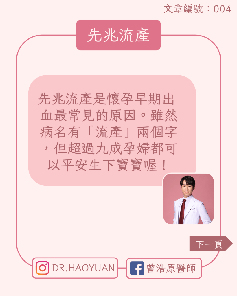 先排除了上述一些嚴重的狀況,例如子宮外孕、流產等。剩下的病人大部分會落到先兆流產(或稱迫切性流產)這個診斷。聽起來有「流產」這兩個字很可怕,但其實只是根據英文病名(threatened abortion)的翻譯,不要被名字嚇到。