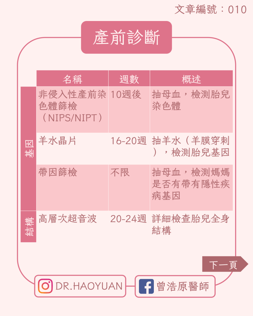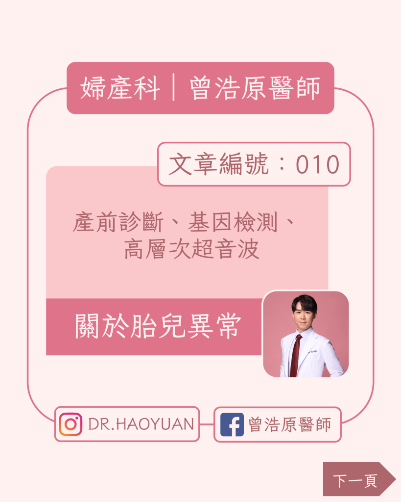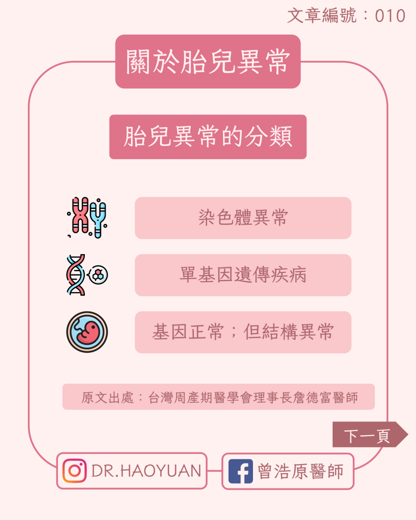 產檢的其中一個重要目的,就是檢查胎兒有沒有異常,並及早介入治療。今天分享一篇很棒的文章,簡單明瞭地介紹常見的胎兒異常種類及相關的基因檢測項目,相信對所有準媽媽都很有幫助。原文作者是台灣周產期醫學會理事長詹德富醫師。曾浩原醫師經理事長同意,將本文內容製作成圖片與大家分享!